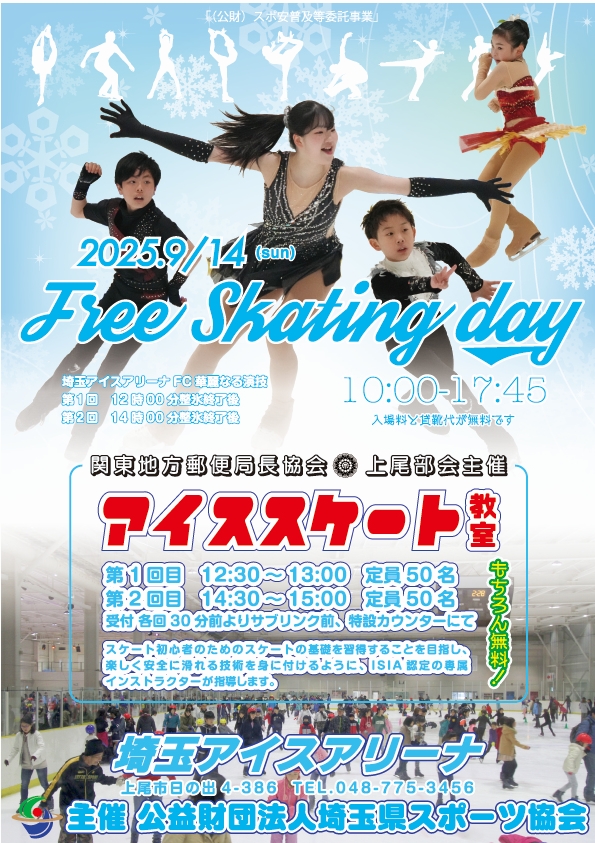 このたび、関東地方郵便局長会上尾部会主催のアイススケート教室を開催します!同日(10:00~17:45)は、メインリンク・サブリンクともに無料でご利用いただけます。冬の本格シーズン前に、ぜひご来場ください。