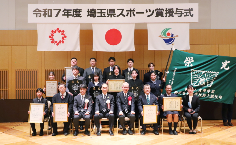 令和7(2024)年度に活躍した選手やチーム・団体(国民スポーツ大会を除く)、スポーツ振興発展に貢献された関係者らを表彰する埼玉県スポーツ賞の受賞者が決定。令和8年3月8日にTHE MARK GRAND HOTEL(さいたま市中央区)で授与式を開催し、総勢24団体436名に各賞が贈られました。この中で栄えある栄光旗は、昨年夏のインターハイで県勢として14年ぶりに女子総合優勝を果たした西武台高等学校陸上競技部が受賞。栄光楯には、全国中学校体育大会の陸上競技男子4×100mリレーで日本中学新記録で制した久喜市立栗橋東中学校陸上部やスポーツクライミングユース世界選手権U19ボルダー優勝の山田航大選手など、1団体7選手が受賞しました。